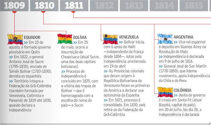 Formação de novos Estados independentes entre 1810 e 1825 (exceto Brasil, que se tornou independente em 1822 e manteve monarquia).